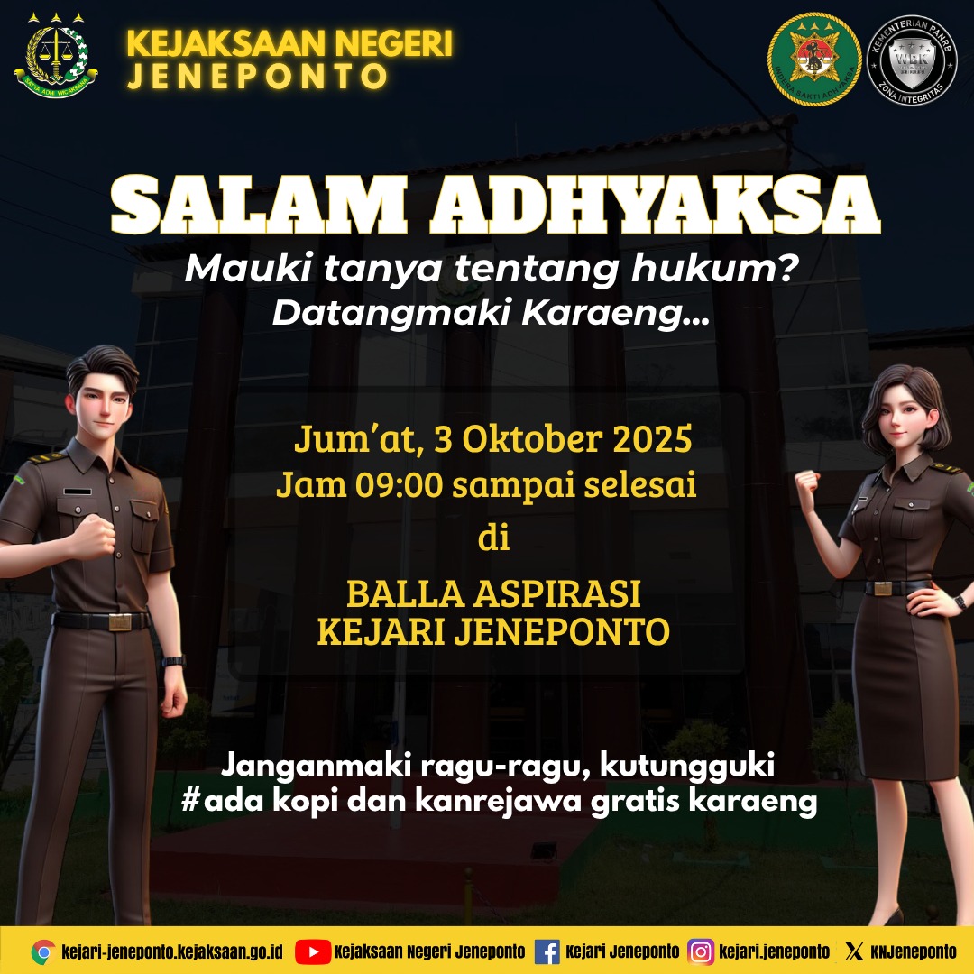 RAKYAT NEWS, JENEPONTO – Kejaksaan Negeri Jeneponto siap menggelar Balla Aspirasi, sebuah inovasi dialog terbuka sekaligus wadah solusi hukum bagi masyarakat, yang digelar Jumat, 3 Oktober 2025 pukul 09.00 WITA di halaman Kantor Kejaksaan Negeri Jeneponto. Lewat ajang ini, masyarakat bukan hanya dapat menyampaikan aspirasi dan pengaduan terkait pelayanan dan penegakan hukum, tapi juga berinteraksi langsung dengan para penegak hukum untuk mendapatkan jawaban dan solusi tepat.