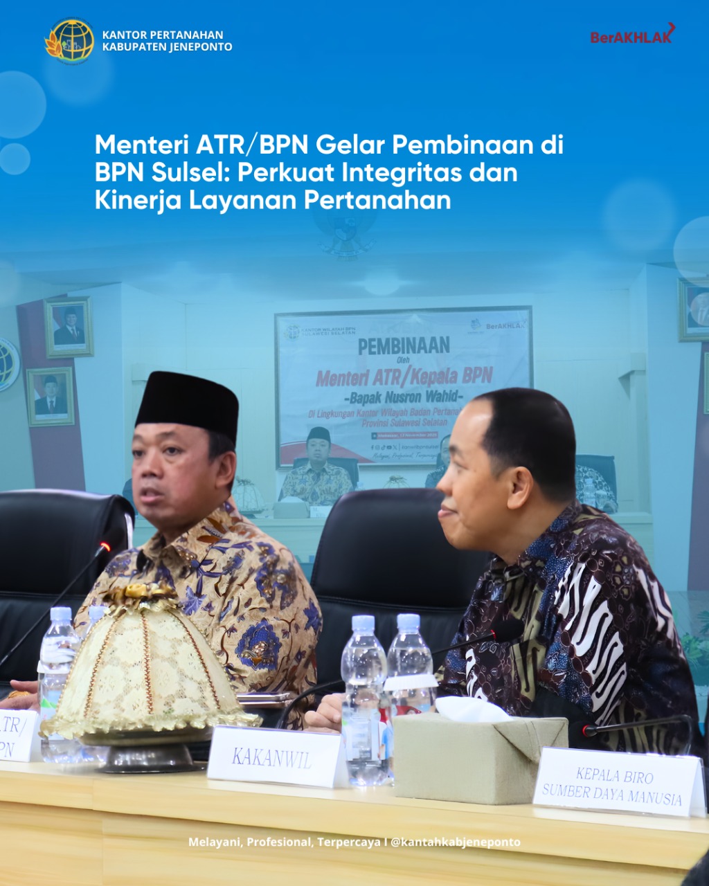MAKASSAR, MATASULSEL – Menteri Agraria dan Tata Ruang/Kepala Badan Pertanahan Nasional (ATR/BPN), Nusron Wahid, memberikan pembinaan kepada jajaran Kantor Wilayah (Kanwil) BPN Provinsi Sulawesi Selatan pada Kamis, 13 November 2025.