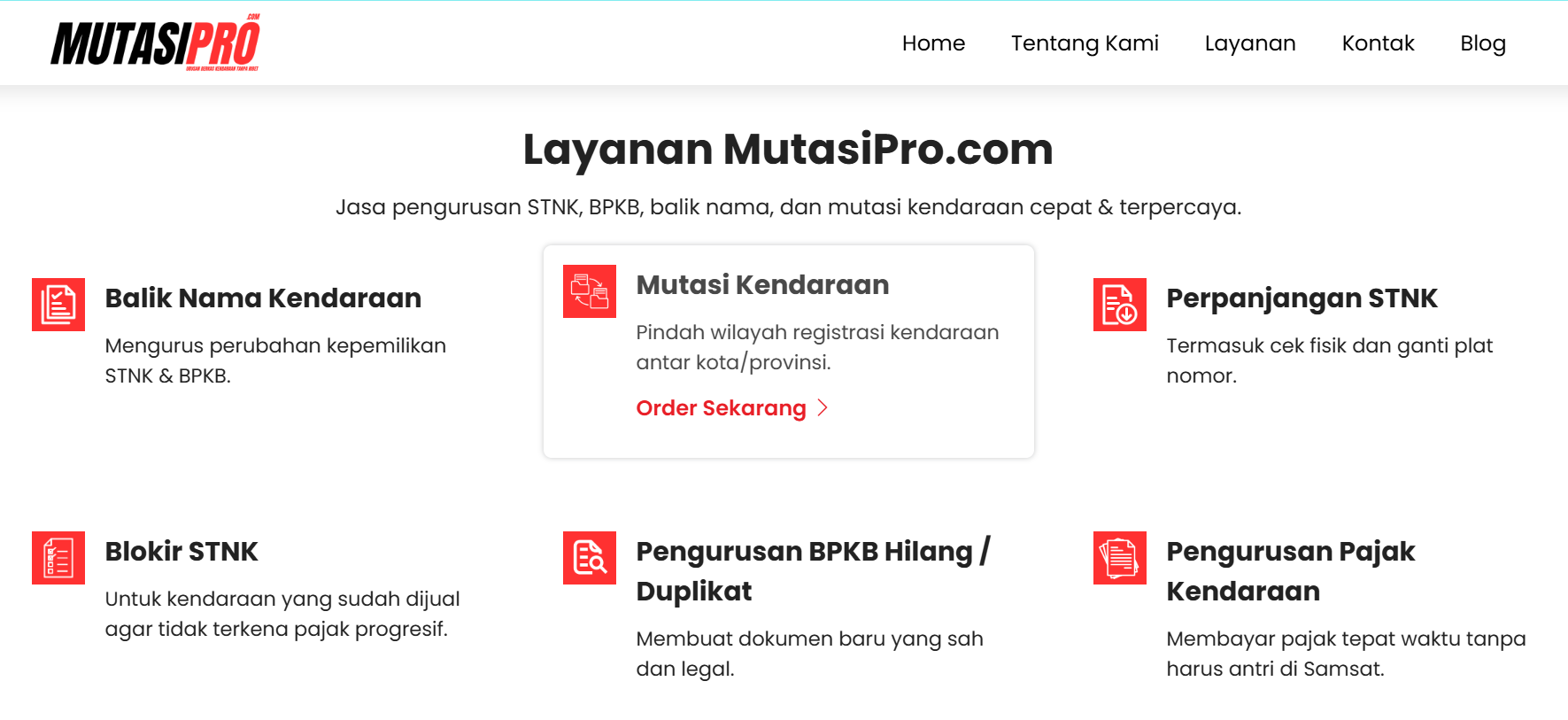 MutasiPro fokus memberikan layanan pengurusan mutasi kendaraan bagi individu maupun perusahaan. Layanannya mencakup mutasi antar kota atau provinsi, balik nama kendaraan, pengurusan STNK dan BPKB, hingga pendampingan terkait aturan administrasi kendaraan yang berlaku.