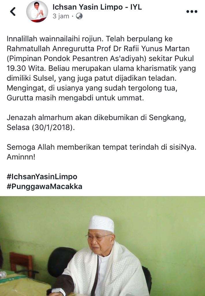 Makassar, Matasulsel – Kabar duka menyelimuti Sulsel. Anregurutta Prof Dr Rafii Yunus Martan, meninggal dunia. Ulama kharismatik itu