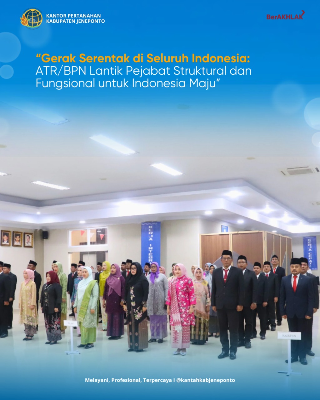 JENEPONTO, MATASULSEL – Kantor Pertanahan Kabupaten Jeneponto turut berpartisipasi dalam kegiatan Pelantikan dan Pengambilan Sumpah/Janji Pejabat Struktural dan Pejabat Fungsional yang digelar serentak oleh Kementerian Agraria dan Tata Ruang/Badan Pertanahan Nasional (ATR/BPN) pada Selasa, 4 November 2025.